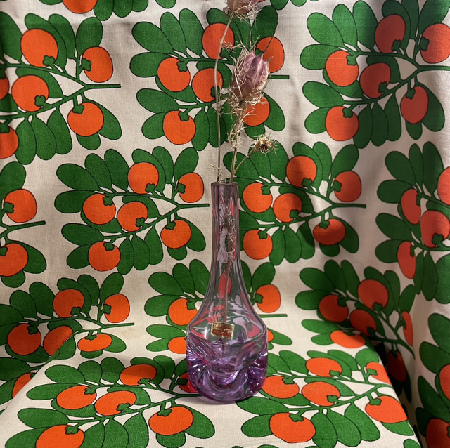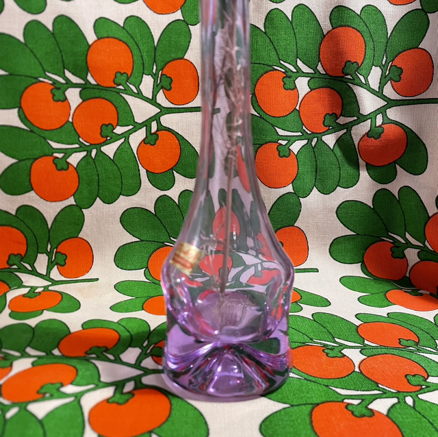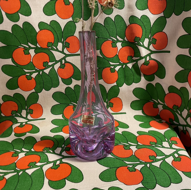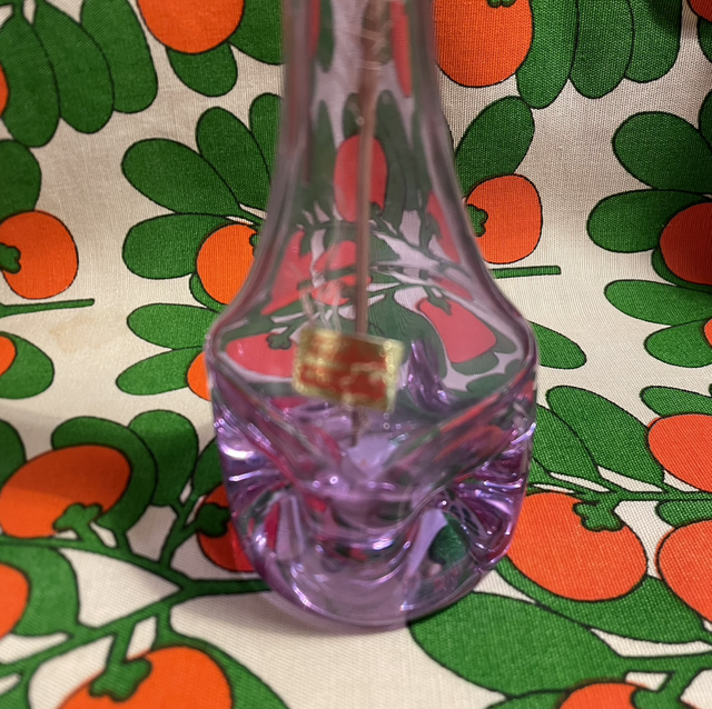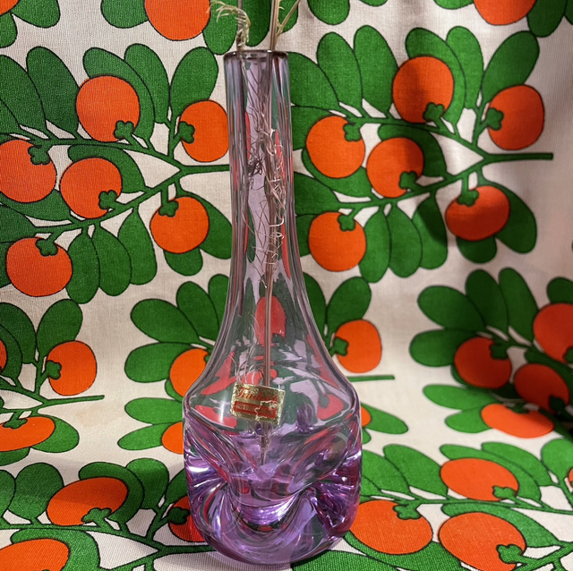 Klein vaasje in lila glas, mondgeblazen, met origineel etiket.