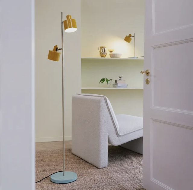 Deze lamp is gemaakt in metaal,160cm hoog , met 2 richtbare spots, voet schakelaar op het snoer van 1,8m . Fitting E14.